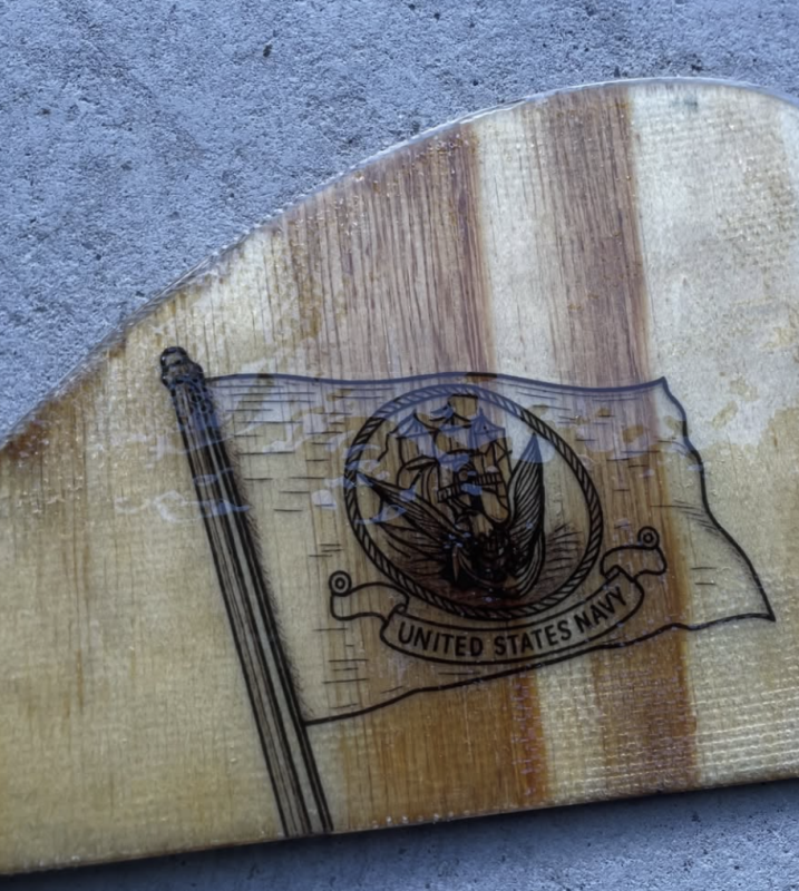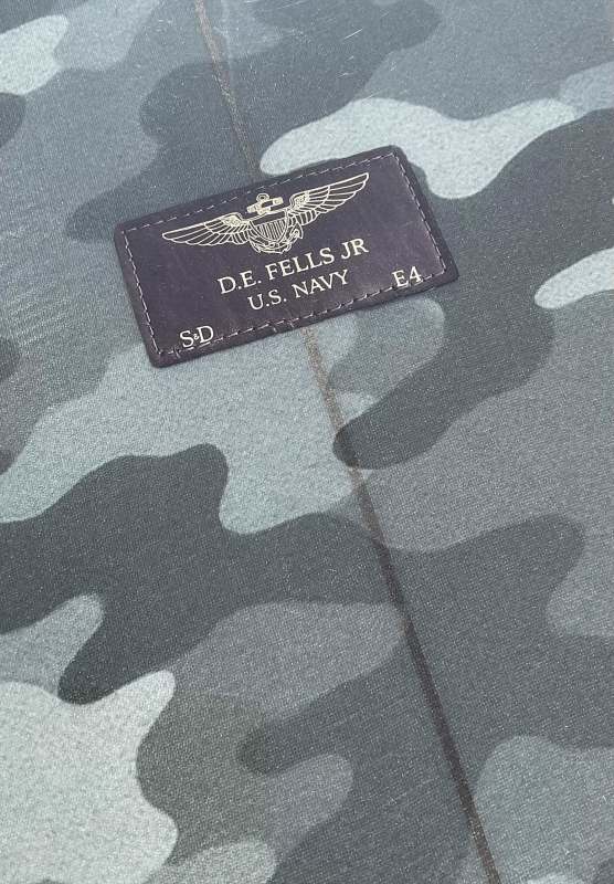 Every time they would talk, new details would emerge that he incorporated into the board: “He is a huge Tampa Bay Buccaneers fan so on one fin I had the Buccaneers flag on the inside of the fin and on the other fin it was the Navy Flag. The patch on the board is a replica of the patch that they had on Navy Jackets at the time.”